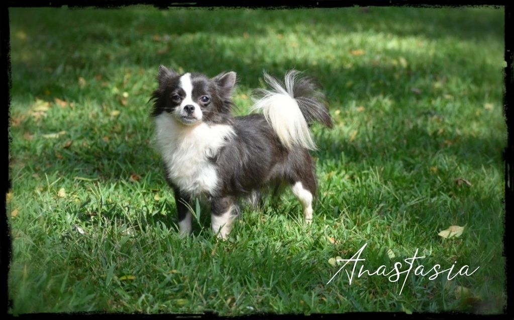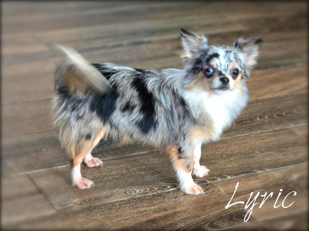 Lyric is one of our silliest girls! She is a long-haired black merle girl with such a sweet and funny personality. She has one ice blue eye that really makes her unique and stand out! She is daughter to our Sugar Baby and Papi. Lyric is registered with CKC. She weighs 5 pounds and has been health tested with Embark.