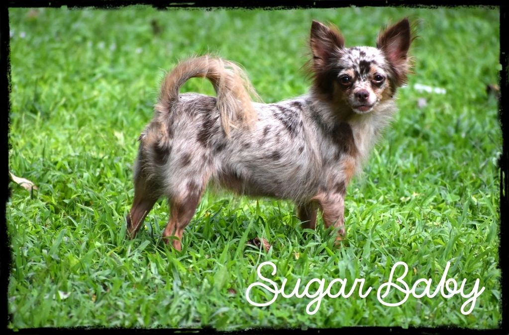 Sugar is a lovely long-haired chocolate merle girl who is registered CKC. sire is full of sass and just so sweet! Sugar Baby weighs 6 pounds. She has been genetically health tested with Embark.